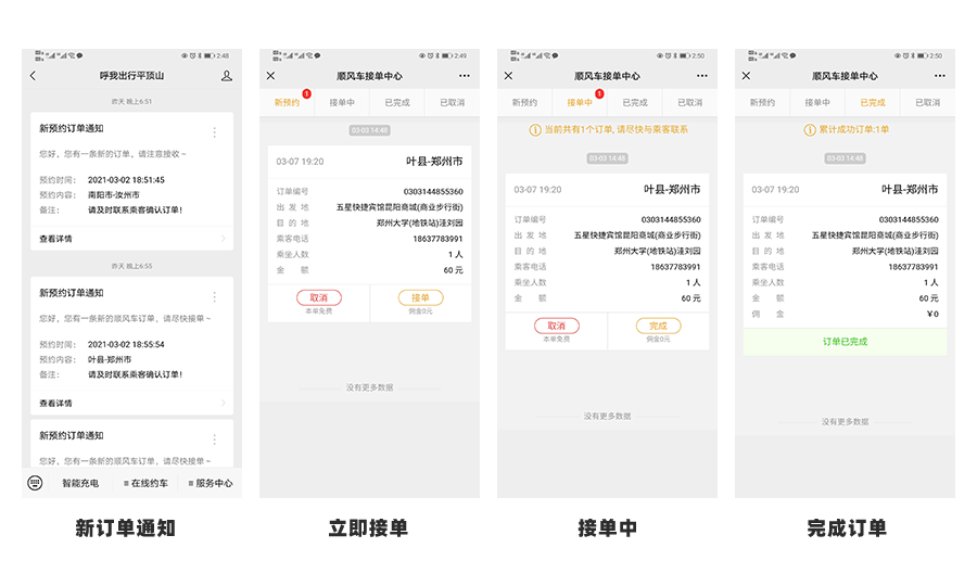 平台采用微信模板消息提醒,用户下单,车主接单,车主入驻,平台都会发送微信提醒