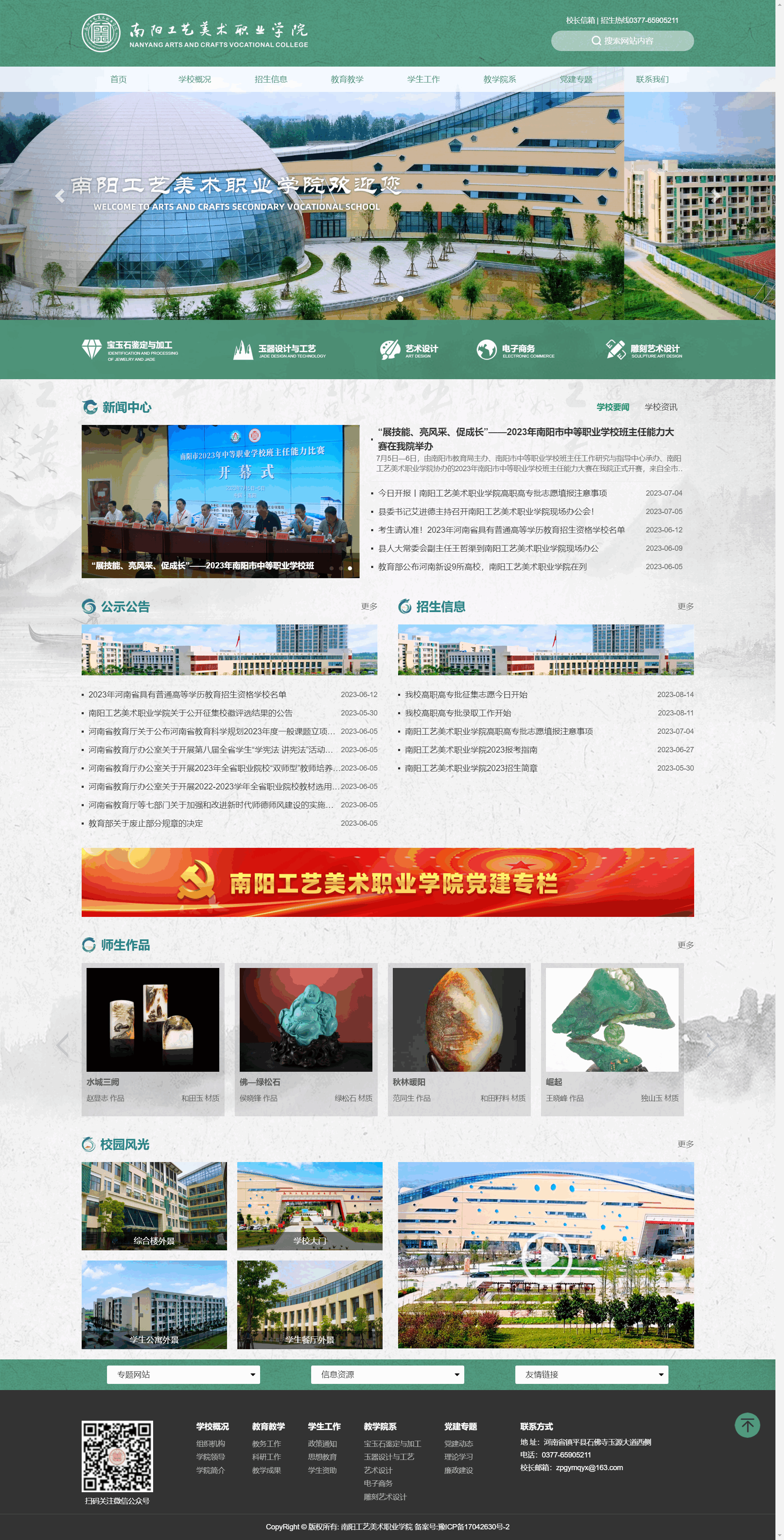 南阳工艺美术职业学院是经河南省人民政府批准,教育部备案,于2023年1月新组建的一所公办全日制专科层次高等职业院校。学校位于拥有“中国玉雕之乡”、“中国地毯之乡”、“中国民间艺术之乡”等美誉的南阳市镇平县,占地面积320亩,建筑面积20万平方米。现有专任教师356名,研究生以上学历75人,中高级教师176人,双师型教师122人,聘请了相关行业、企业的专家或玉雕大师担任兼职教师,形成了一支品德高尚、专兼结合、经验丰富、业务精湛的师资队伍。这里毗邻镇平县省级生态湿地赵河公园和国家AAAA级旅游景区国际玉城,交通发达,风景如画,环境宜人。
