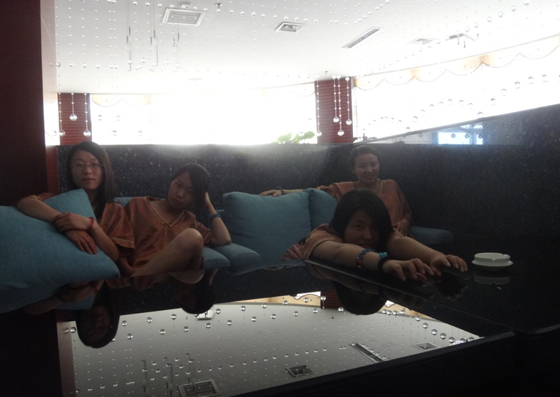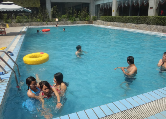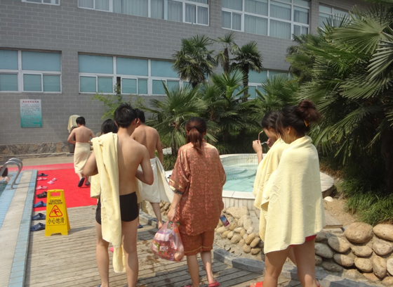 趁着经理去买票,我和几个同事在这里合影,大厅里边很大,很干净,摆设了很多了室内盆景。置身这里不会感觉到压抑和拥挤。我们还没熟悉周围的环境,便被经理召唤着进去。走进去有两个方向,分别通往男女更衣室。光线很柔和,每个人可以选择一个柜子,将自己的物品放好后锁上,这个钥匙有点特别,不是我们平时用的钥匙,像一块大电子,用一根有弹性的线系着,可以戴到胳膊上,需要开门时,服务员会先输入什么,然后用这个特殊的钥匙照一下,门便开了。这样种方式让我们觉得很安心。我们各自穿好自己的泳衣,看着镜子中的自己,我觉得有点尴尬,第一次在公共场合穿成这样。不过这种感觉很快便没有了,因为大家都穿成这样,索性都互不认识。在更衣室的出口处,有一个浴巾供应处,每个泳客都可以领到一条干净干爽的浴巾。我们把浴巾裹到身上,只露出一个头和两条腿。同去的男同事倒是利索,已经在场地等我们了,互相看了看对方的穿着,似乎也并没有多少尴尬。一队人便随着人流走动起来了