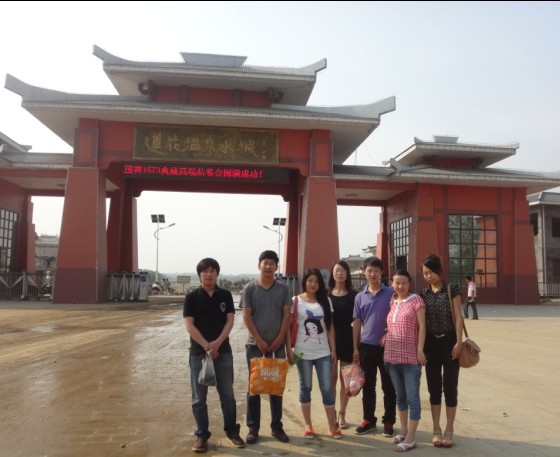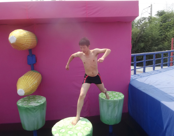 忽然听见远处有敲锣声,跑过去一看,原来是大闯关,就是电视上爸妈常看的那个莲花温泉大闯关,没想到今天能亲眼看到,现在还没开始,各队的队员在尝试,第一个是翻转莲花,第一关看似容易,其实很难,需要能很好的掌握平衡和速度,因为除了中间的轴是固定的,两边是会动的。经理试了一把,虽然重心偏向一边,差点掉进水里,但是由于速度极快,还是成功了。第二关是高台滑坡,这个相对容易一点,只要拉着一根绳子往上爬就行。第三关是狼牙棒,这个难度有点大,中间有一个类似独木桥的棒,但是这个棒会转动,再加上棒很细,想要平稳的在上边走,很是不容易。第四关是旋转时空,中间有很大一个回转的圆盘,挑战者需要跳上去,并不被转掉。第五关是飞檐走壁,在水上有一些柱子,挑战者需要跳过这些柱子,但是,右边的墙上随时会出来玉米棒,将挑战者打到水里。所以,难度也很大。等了好一会,还不见开始,于是我们合照留照就离开了