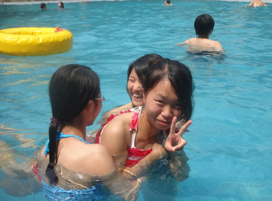 上边的人看的只想笑,开导我们说,不要去依赖别人,多练习,喝几口水是没关系的。虽然感觉不好意思,觉得这话还是有几分道理的。我脱离了她们的帮助,刚开始是喝了几口水,不过还真的能在水里扑腾几下了,慢慢的竟然能游出几米远,这样的成果对于刚开始游泳的我们来说已经很不错了。可是慢慢的,我们的胳膊便不行了,连扑腾的力气都没,只好停下来休息。小潘和老仝也是旱鸭子,看着我们几个女生自学有了成果,便不停的问我们怎么游,还不要说,心里真的有一点成就感。张总本来就会游泳,自己玩的起劲,也不怎么理我们。不过我猜想,可能是他媳妇在上边观看,所以他要趁这个机会好好表现一下。正当我们玩劲消退时,广播上传来冲浪的消息:各位游客,上午好,冲浪活动现在开始了,欢迎大家前来体验。心里又是一阵狂喜。大家直奔冲浪场地去了,这里已经聚集了很多人,有的人已经下水去了,原来,这里的浪是上游开闸,采用水势形成的,我们赶紧换上了救生衣,也下了水,刚开始浪比较小,我们很快的前进着,慢慢的,浪越来越大,不仅前进不了,还随着浪的摆动原来越远,正当我们奋力前进的时候,一个很大的浪扑了过来,我还没做好准备,整个头部被浪盖着了,瞬间脑袋像是被注满了水,分不清方向,思维完全被封着,幸好同事拉着我的手,慢慢的把我拉到了浅水区,我们发现,只有当浪来的时候会淹没我们,只要我们随着浪往轻的往上跳一下,就不会淹没头部,这个方法果然凑效,我们手拉手,一起在浪尖上跳跃。大概半个小时,水面恢复了平静。我们只好爬上岸,拍了几张照片。