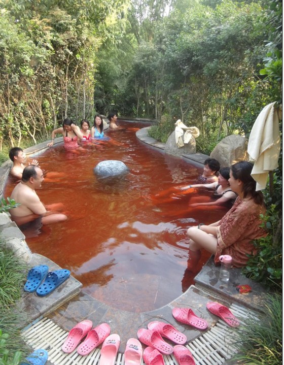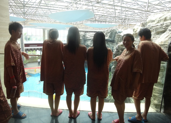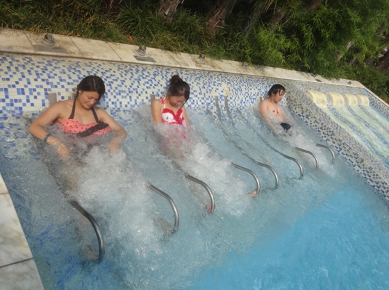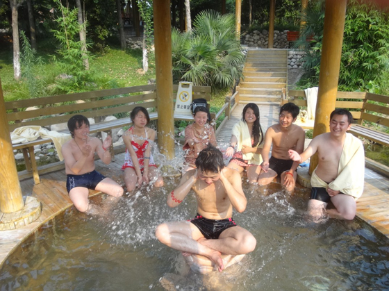 半个小时候,我们出了餐厅的门,进入了休息室。休息室里很暗,有很多床位,每个床位配有一个液晶电视。右边是一个服务台,给游客提供水和水果,服务很是周到,只是游客太多,床位似乎不够用。大概过了一个小时,我们出了休息室,来到了百草药泉,那里边有各种配料的温泉,有红酒浴、玫瑰浴、丁香浴、当归浴、牛奶浴等等,整个下午,我们都沉浸在温泉带给我们的舒适中。